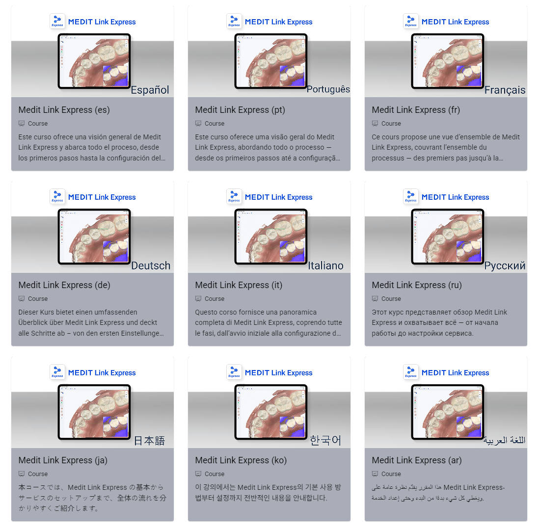 - Medit Link Express course now available in multiple languages (Spanish, Portuguese, French, German, Italian, Russian, Japanese, Korean, and Arabic)